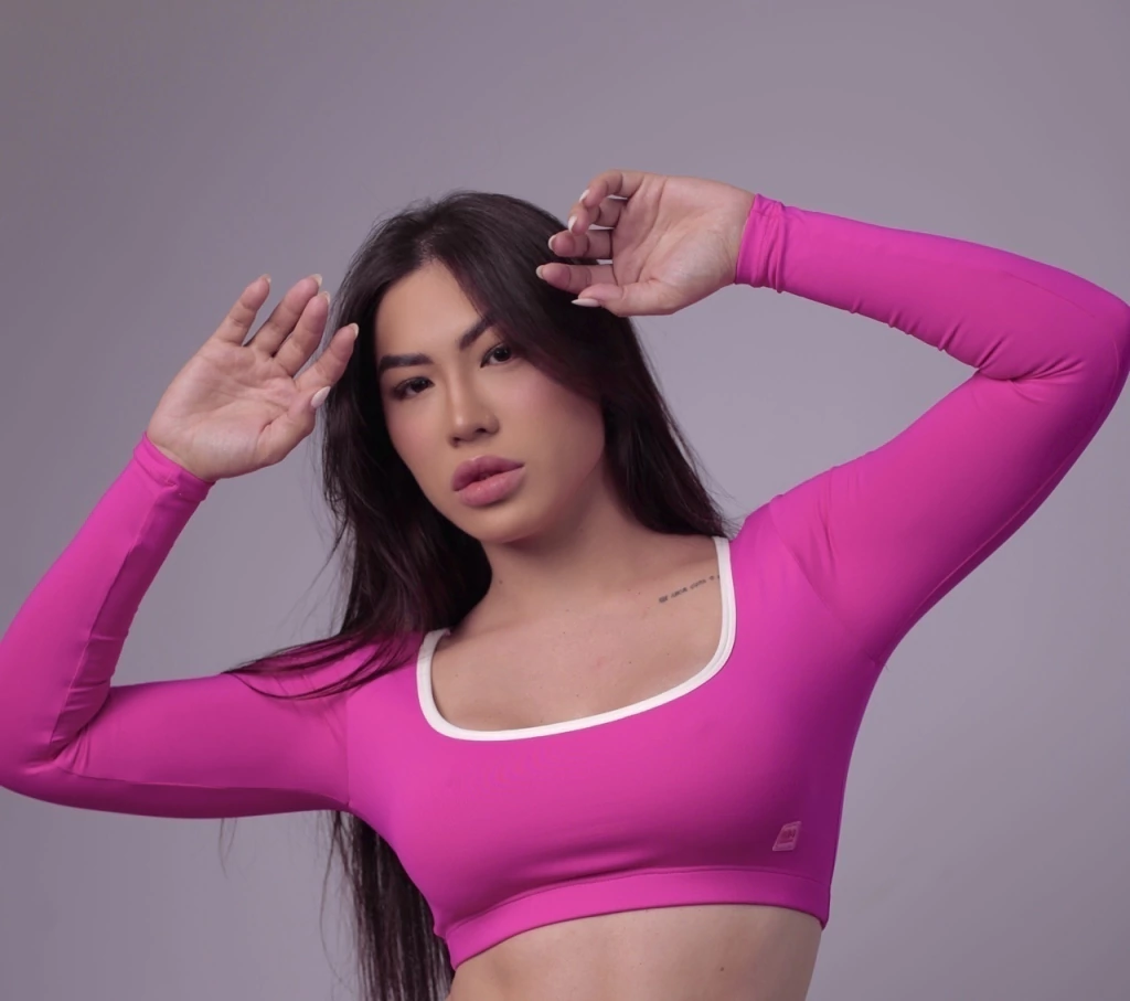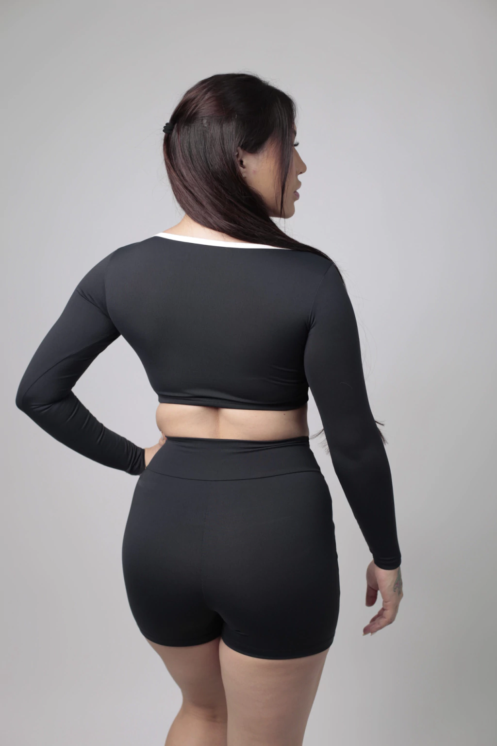 Cropped feminino fitness com mangas longas e detalhe branco no decote. Modelo justo que valoriza a silhueta, unindo conforto, estilo e performance. Ideal para treinos e looks urbanos.