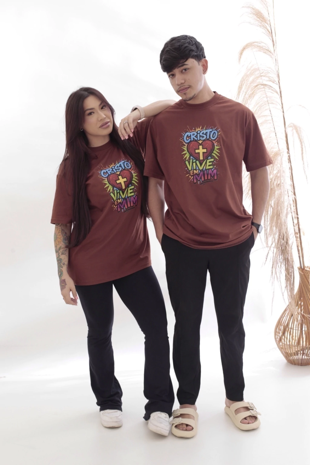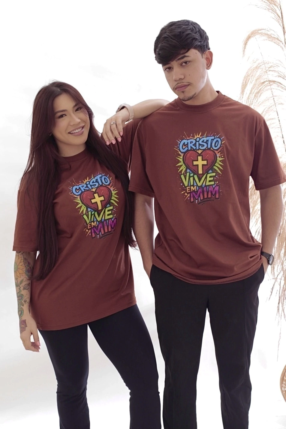 Camisa oversized cristã unissex “Cristo Vive em Mim”. Modelagem ampla, estilo urbano e mensagem de fé. Disponível nas cores rosa e marrom.