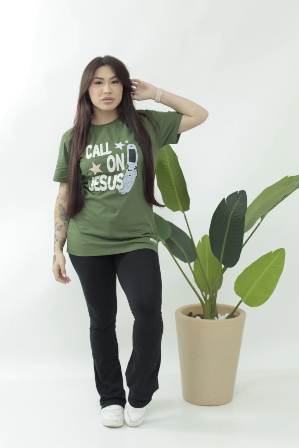 Camiseta unissex cristã com estampa “Call on Jesus”. Confortável e moderna, disponível em verde e cinza. Estilo retrô com mensagem de fé.