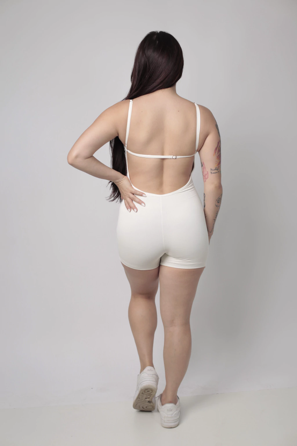 Macacão branco minimalista com alças finas e modelagem ajustada ao corpo. Peça versátil e confortável, ideal para treinos, práticas esportivas ou composições casuais com elegância e leveza.